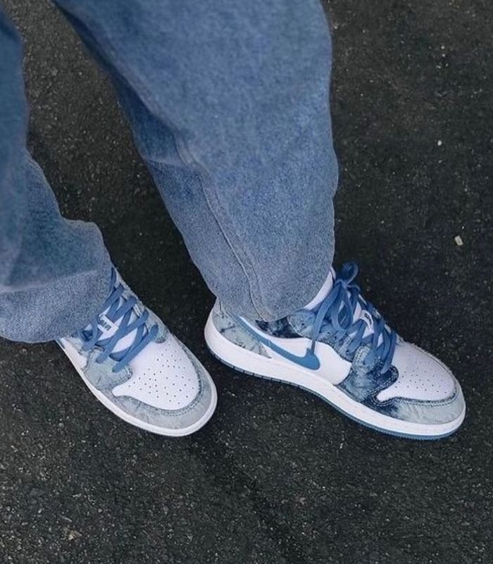 The Jordan 1 Low Washed Denim presents a classic silhouette in colors and materials that give this low-top shoe a unique look. The Washed Denim version of the Jordan 1 Low-Top features a smooth white leather upper with perforations at the toe. The overlays are made of denim in midnight navy blue and white, which gives the denim a washed-out look. The laces are in monochrome Midnight Navy Blue, as are the edge of the tongue, the insole and the insole with a white Jumpman. The washed denim tongue also has a white Jumpman. The white foam midsole with tonal stitching features encapsulated Air cushioning and the rubber outsole in Midnight Navy Blue offers traction in a pattern of concentric circles. The low-top presents a perfect spring aesthetic through a white textile, linen-like base accented by washed-out denim overlays. Light blue leather Swooshes followed by contrast accents throughout and a rubber outsole, while a white midsole is inserted in between, complete the design This offering of the Air Jordan 1 Low features a white textile canvas-like base and tongues with washed denim overlays. Blue leather Swooshes, contrasting accents and a rubber outsole atop a white midsole round out the design. Whenever spring and summer are around the corner, the entire Nike umbrella brings out the tie-dye patterns and bright pastel hues. The upcoming Air Jordan 1 Low deviates considerably, however, as it features acid-wash denim on all overlays. The finish, usually associated with rock ‘n’ roll, doesn’t seem at all unfamiliar considering the brand has only relatively recently paid homage to the music genre. Here it adorns the toe, collar, upper and many of the inserts in between, contrasting with the smooth white leather foundation underneath. The Swoosh, profile, laces and the like, however, serve to complement the various cool tones, each just a few shades away from the popular “University Blue.”