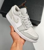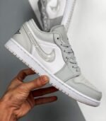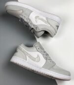 A modern take on an old classic, the Air Jordan 1 Low White Camo finds new ways to incorporate camouflage patterns. The design comes in pure white with light grey on the upper, eyelets, collar, heel and outsole, while white provides contrast in the middle. By combining white and gray into a camouflage pattern, each Swoosh wraps around the back of the shoe and connects to the other Swoosh on the opposite side. The laces themselves are also gray and the toe is made of perforated leather. A black Jumpman adorns the tongue and a black Air Jordan Wings logo appears on the heel. The Air Jordan 1 Low White Camo reps released in November 2020. Before returning to its original form in Spring 2021, the Air Jordan 1 Low will continue to release in much more experimental versions than its biggest counterpart. The latest example, which emerged following multi-colored and atypically accented iterations, comes with camouflage Swooshes. The pair is somewhat reminiscent of the Dior Jordan 1 and the Jordan 1 “Tokyo” and features a white base covered in light grey tumbled leather inserts. The midfoot carpet pad deviates from the model’s standard leather construction in favor of a canvas-like material. Jordan Brand-specific branding breaks up the bright color palette with its black composition, while the profile logos feature a grayscale camouflage pattern. Soles underfoot don’t take part in the experimentation, opting for a sleek combination of white midsole and grey outsole.